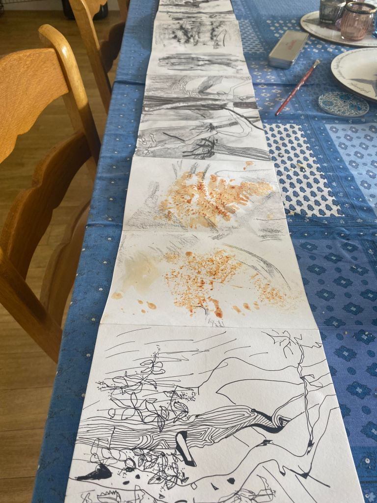 I tend to work using concertina books which allows each page to flow from one to the other. Below you will find my interpretation of today’s trees! with their smells & sounds ………